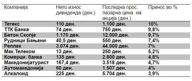 За вас, почитувани читатели „Фактор“ ги рангира десетте компании врз основа на дивидендата што ќе ја делат како учество во последната просечна пазарна цена. За сите е заедничко што се подобри и од најдобрите банкарски камати!