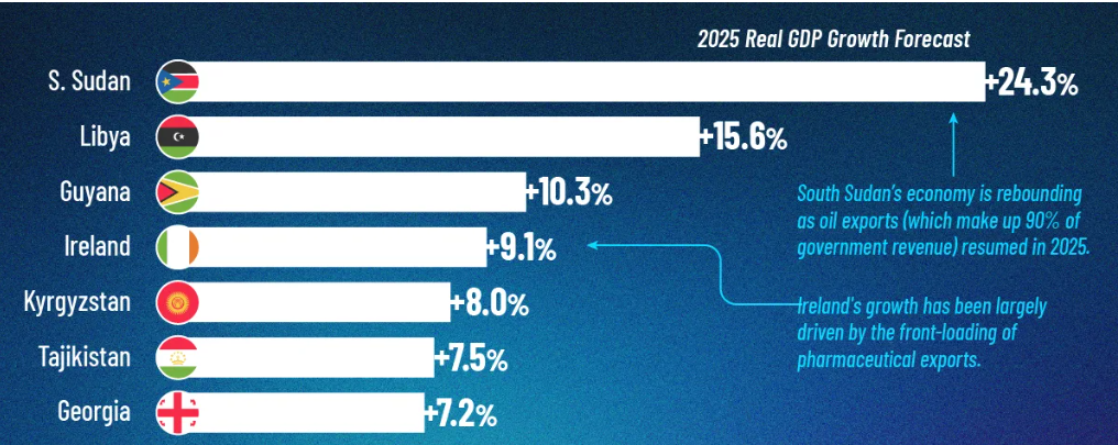Од Јужен Судан до Етиопија, силата на извозот ги движи клучните економии во 2025 година. Оваа инфографика ги прикажува најбрзорастечките економии во 2025 година, врз основа на проекциите од најновите светски економски перспективи на Меѓународниот монетарен фонд (ММФ).
