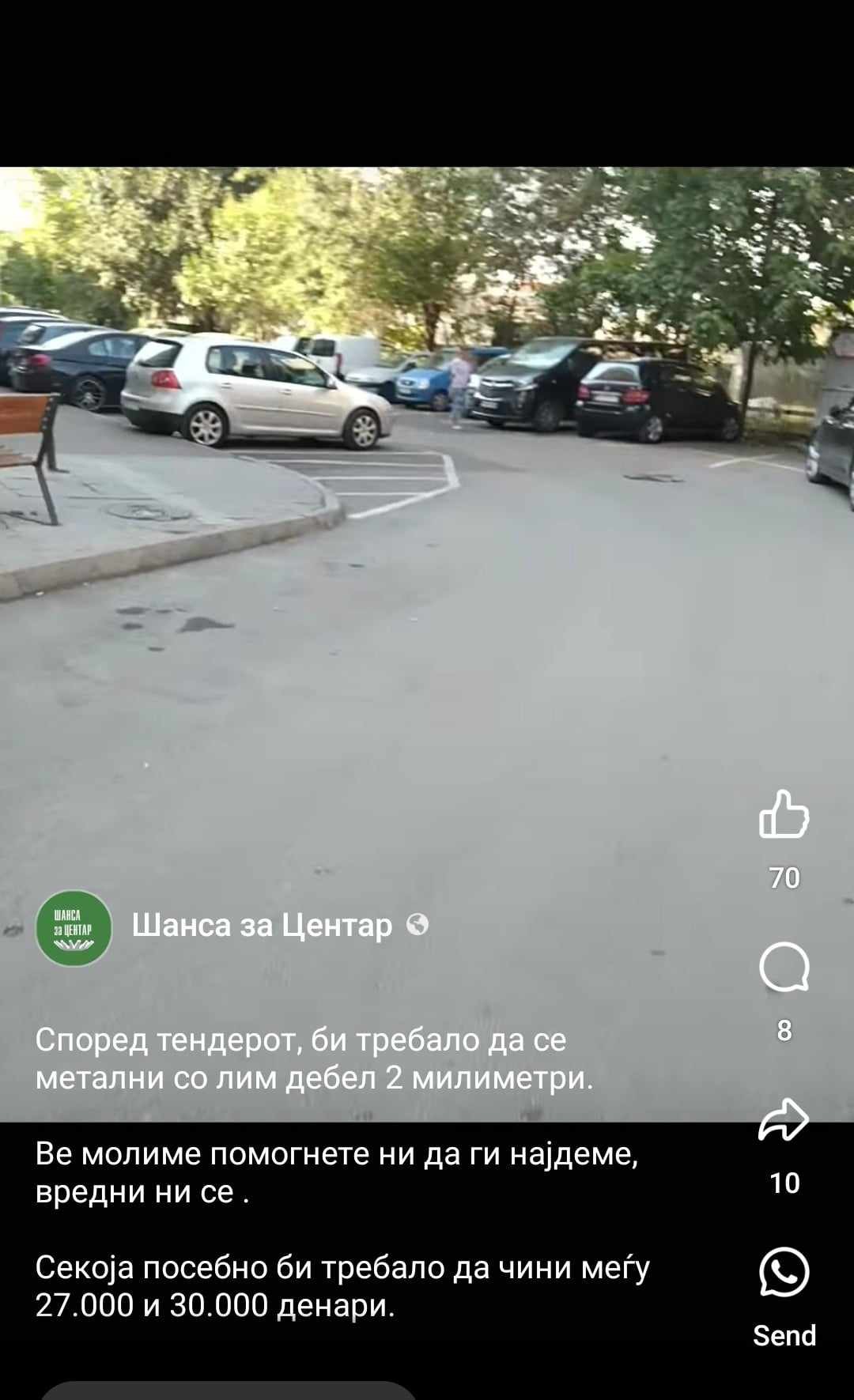 „Комшии помагајте! Ни фалат жардиниери. Општината во извештај тврди дека за 2 милиони и 197 илјади денари се поставени нови жардиниери некаде пред Трготекстил и на паркингот зад Малага. Три пати прашавме дали се сигурни рекоа да, но никако да ги најдеме. Според тендерот, би требало да се метални со лим дебел 2 милиметри. Ве молиме помогнете ни да ги најдеме, вредни ни се. Секоја посебно би требало да чини меѓу 27.000 и 30.000 денари“, стои во нивната објава на фејсбук.