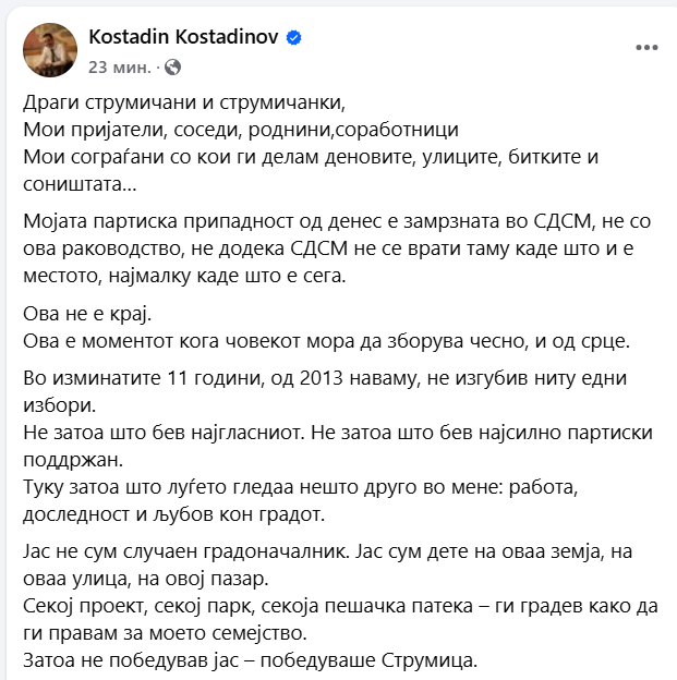 „Драги струмичани и струмичанки, мои пријатели, соседи, роднини, соработници, ои сограѓани со кои ги делам деновите, улиците, битките и соништата… Мојата партиска припадност од денес е замрзната во СДСМ, не со ова раководство, не додека СДСМ не се врати таму каде што и е местото, најмалку каде што е сега. Ова не е крај. Ова е моментот кога човекот мора да зборува чесно, и од срце. Во изминатите 11 години, од 2013 наваму, не изгубив ниту едни избори. Не затоа што бев најгласниот. Не затоа што бев најсилно партиски поддржан. Туку затоа што луѓето гледаа нешто друго во мене: работа, доследност и љубов кон градот. Јас не сум случаен градоначалник. Јас сум дете на оваа земја, на оваа улица, на овој пазар. Секој проект, секој парк, секоја пешачка патека – ги градев како да ги правам за моето семејство. Затоа не победував јас – победуваше Струмица. Но денес стојам пред вас и ви кажувам нешто што ретко кој политичар ќе го признае: Во сегашната политичка слика, мојата кандидатура – од било која партија – е бесмислена. Не затоа што се плашам од пораз. Јас не знам што значи да изгубиш избори. Туку затоа што нема вистинска понуда за градот. Нема суштинска дебата. Нема нова визија. Нема предизвик. А човек што нема предизвик – ќе победи, но ќе тапка во место“, вели Костадинов.