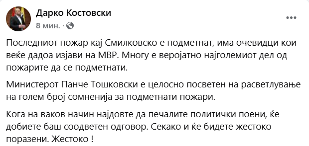 КОСТОВСКИ: Последниот пожар кај Смилковско е подметнат, има очевидци кои веќе дадоа изјави