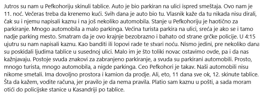 „Утрово ни ги симнаа регистарските таблички во Пефкохори. Автомобилот беше паркиран на улицата пред сместувачкиот капацитет. Ова ни е 11-та ноќ. Вечерва треба да се упатиме кон дома. Автомобилот беше таму цел ден. Сопственикот вели дека никогаш не го допреле, дури и му напишале казна нему и на уште неколку автомобили. Ситуацијата со паркирањето во Пефкохори е хаотична. Многу автомобили, а малку паркинг. Повеќето туристи паркираат на улица, среќа е ако можат да најдат паркинг место таму. Мислам дека ова е крајно грубо и арогантно од страна на грчката полиција. Во 4:15 часот наутро ни напишаа казна. Како бандити или крадци, тие ги прават овие работи ноќе. Не сме единствените, пред неколку дена им ги симнаа регистарските таблички на луѓето на следната улица. Не им е гајле што оставаме толку многу пари тука, и нè казнуваат. Има знаци насекаде на кои пишува дека е забрането паркирање, а автомобилите се паркирани насекаде. Едноставно кажано, многу туристи, многу автомобили, а нема каде да се паркира. Цел Пефкохори е таков. Нашите коли никому не му пречеа. Има доволно простор и камион за поминување. Но, па, 11 дена сè беше во ред, на 12-ти беа отстранети табличките. Што да кажам, внимавајте, бидејќи правилото е дека нема правила. Ја платив казната во поштата, а сега морам да одам во полициската станица во Касандрија да ги земам табличките“, напиша Ненад.