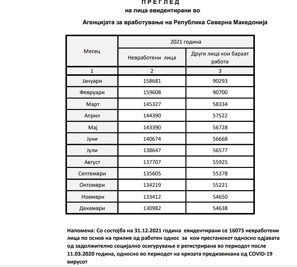 Но, по намалувањето или укинувањето на рестрикциите, бројките на вработени почнуваа да одат надолу, па така, ако во февруари лани имало 159.608 невработени, секој нареден месец невработеноста паѓаше, достигнувајќи ја на крајот на минатата година бројката од околу 131 неврботени.