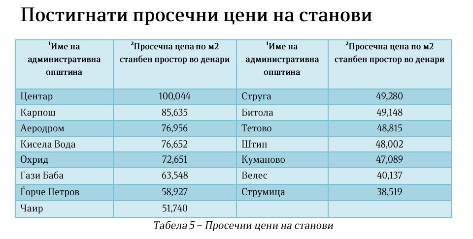 Исто така во општина Центар во Скопје е достигната и највисоката просечна цена за продажба на станови и таа надминува 100 илјади денари за метар квадретен.