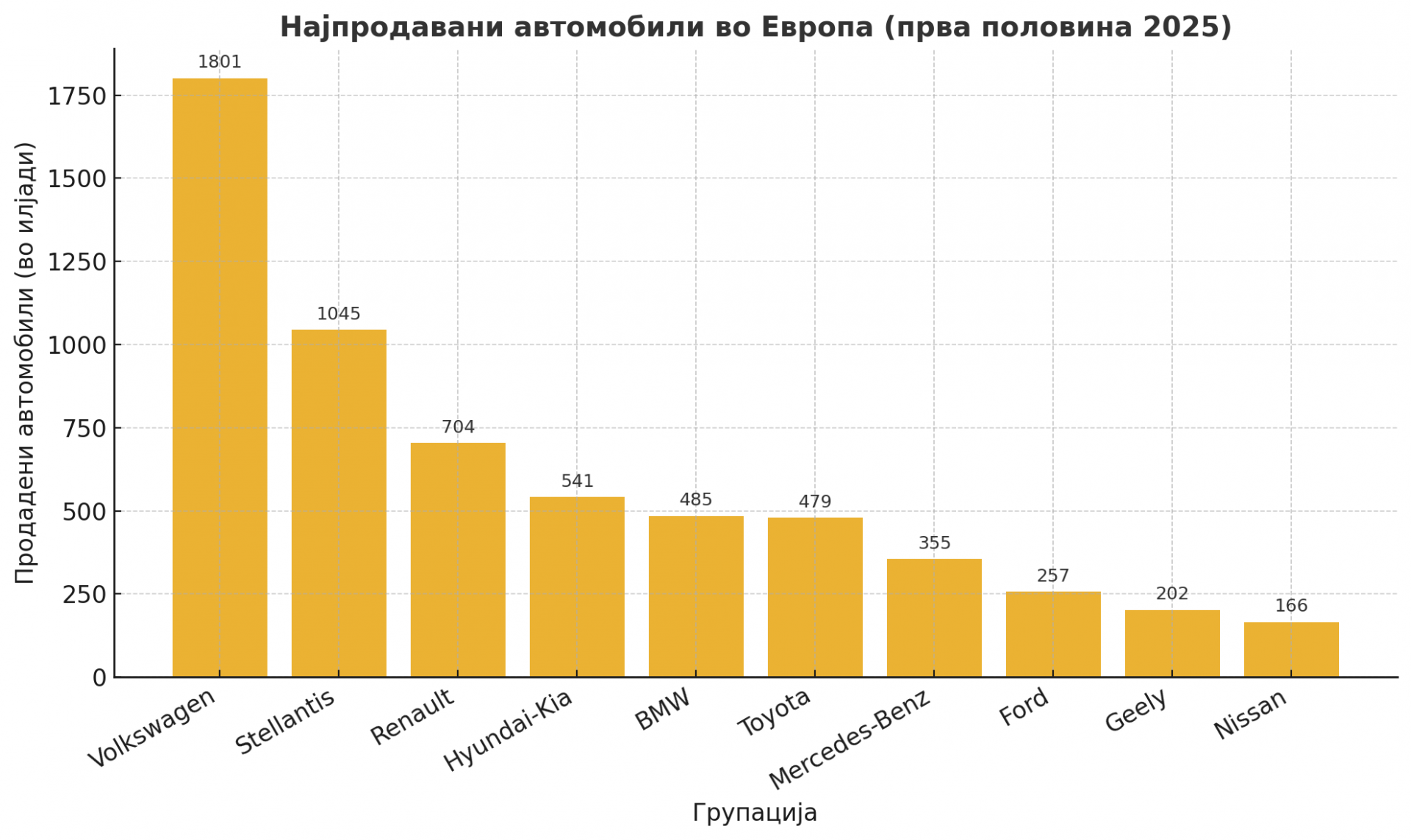 Во првата половина од 2025 година, автомобилската индустрија во Европа ја предводеа најголемите светски производители на автомобили. Инфографикот ги прикажува десетте групи кои забележаа најголема продажба во Европа, врз основа на бројот на продадени возила.