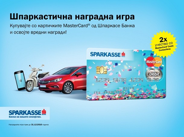Од денес започнува најновата Шпаркастична наградна игра во организација на Шпаркасе Банка Македонија, со богат фонд на награди за корисниците на дебитните и на кредитните картички од брендот MasterCard. Како главна награда банката доделува автомобил „опел астра“, како и други вредни награди, скутер „пјаџиолиберти“и пет мобилни телефони „ајфон 7“.
