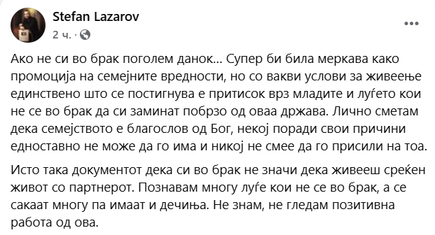 Младиот јутјубер Стефан Лазаров се обрати на социјалните мрежи по тој повод и порача дека иако смета дека семејството е благослов, не се согласува со таквата мерка.