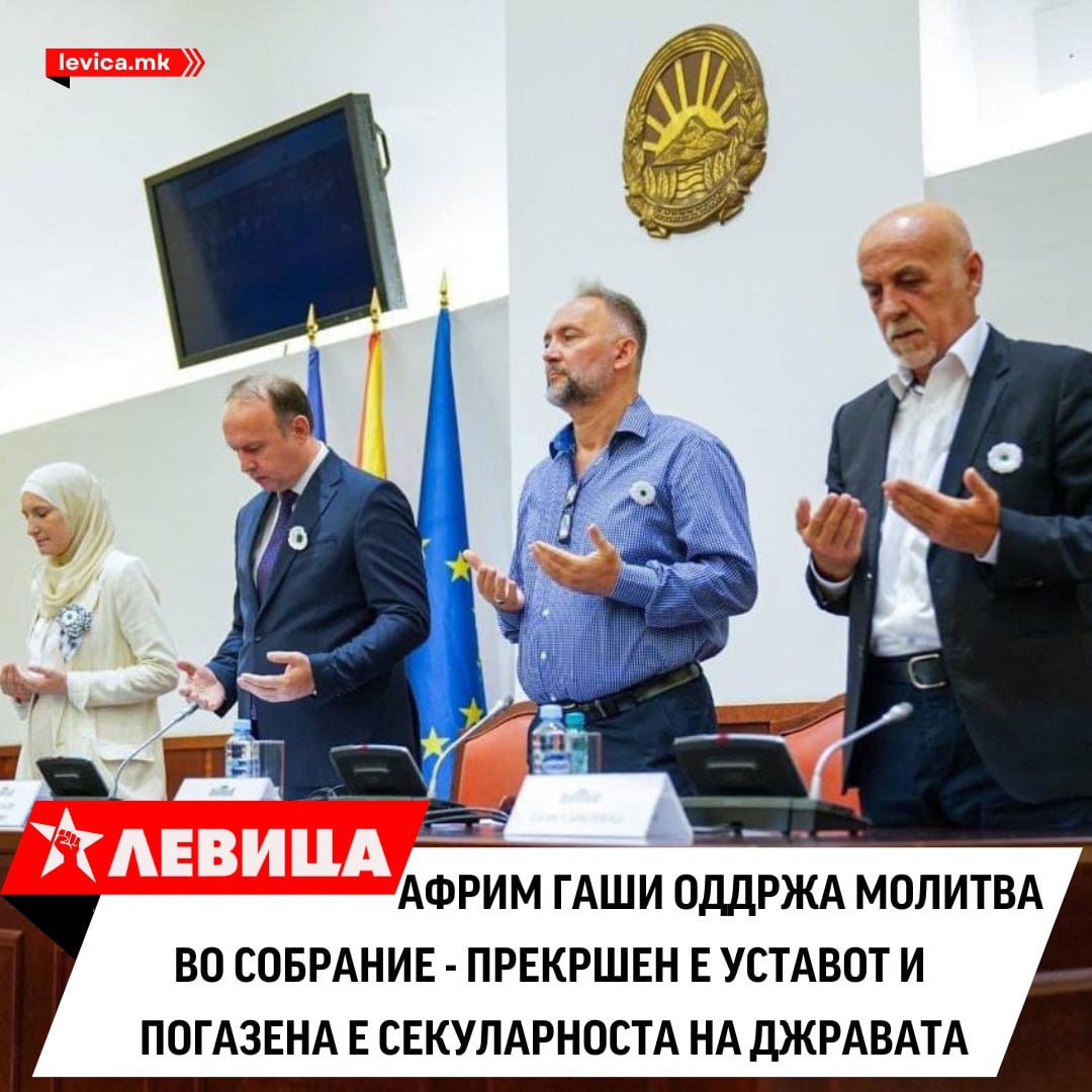 Од Левица реагираат дека во Собранието на Република Македонија, во салата Борис Трајковски се одбележа Денот на сеќавањето на геноцидот во Сребреница, каде коалициониот партнер на ДПМНЕ и ЗНАМ - спикерот Африм Гаши оддржаа молитва, со што го прекрши Уставот на државата, ја погази секуларноста и сите норми на правната држава.