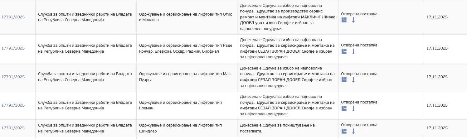 Сумите за кои овие две фирми ќе ги поправаат лифтовите под капата на Службата за општи и заеднички работи не се знае – ќе биде објавена кога СОЗР ќе ги достави потпишаните договори на веб страната на електронскиот систем за јавни набавки.
