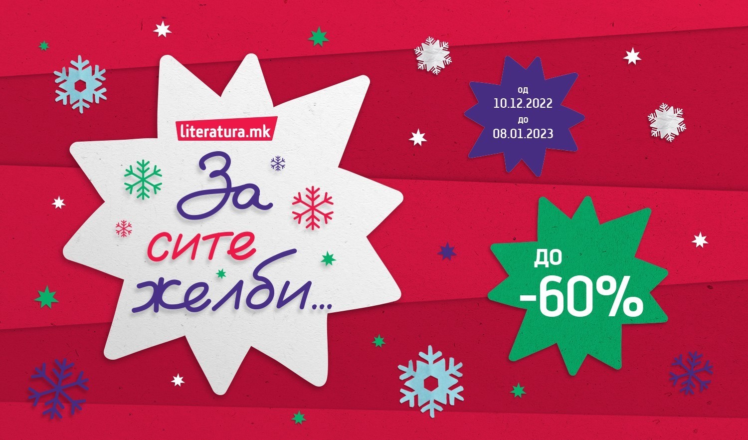 Со попусти до 60 отсто, подароци и музички настапи почнa новогодишното прославување во книжарниците „Литература.мк“. Во акцијата „За сите желби...“, која почна на 10 декември 2022 и ќе трае до 8 јануари 2023 година, има специјални празнични понуди на едукативни пакетчиња за деца, намалувања на цените на книги и пакет книги, како и на различни производи од повеќе брендови, кои се идеален новогодишен подарок.
