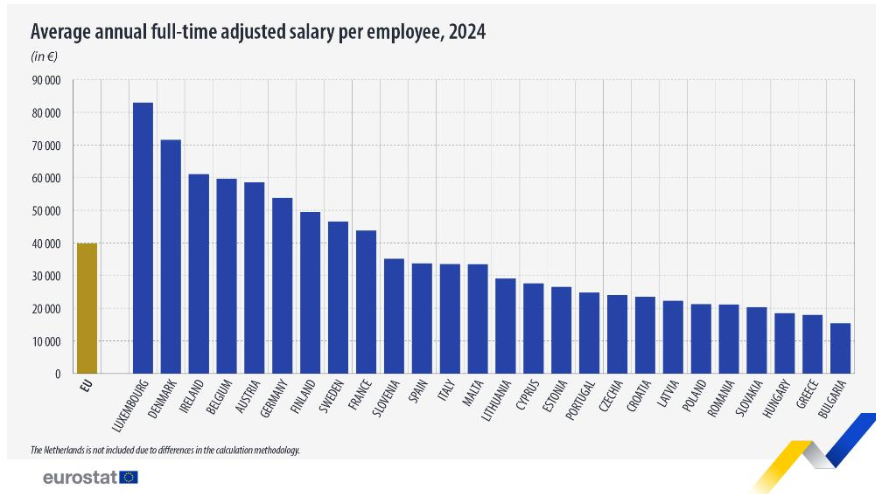 Меѓу државите членки на ЕУ, највисока просечна годишна прилагодена плата за полно работно време е регистрирана во Луксембург во износ од 83.000 евра, а зад неа следуваат Данска со 71.600 и Ирска со 61.100 евра.