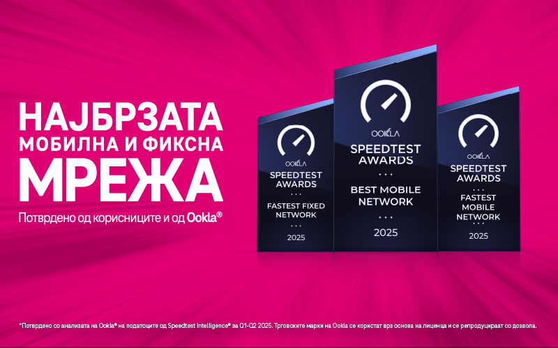 Македонски Телеком повторно ја освои престижната Ookla® награда за најдобра мрежа на пазарот. Резултатите од мерењата покажаа најголема брзина на мобилната и на фиксната мрежа и најдобра мобилна мрежа во првата половина на 2025 година*.