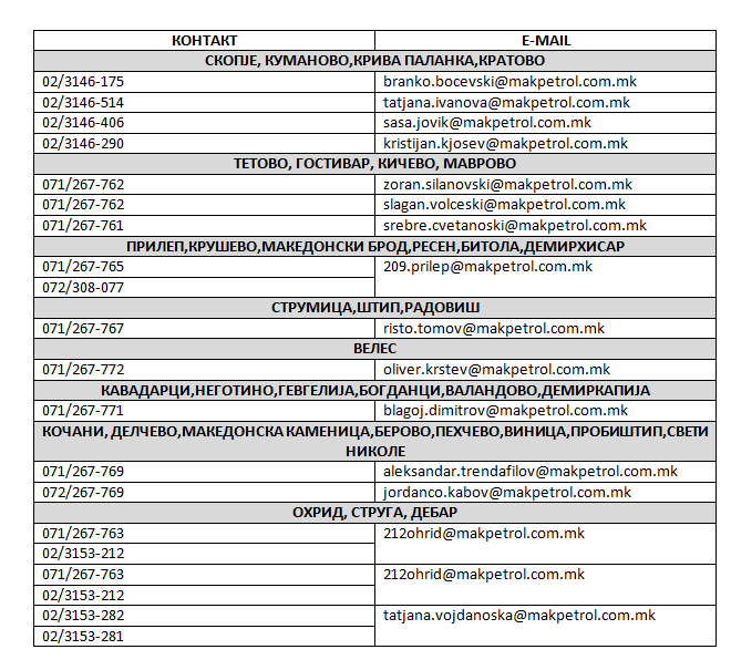 Деталните информации околу уплатата и испораката на екстра лесното масло за домаќинство граѓаните можат да ги добијат на следните телефонски броеви и e-mail адреси, дадени според местото на нивното живеење, односно испорака: