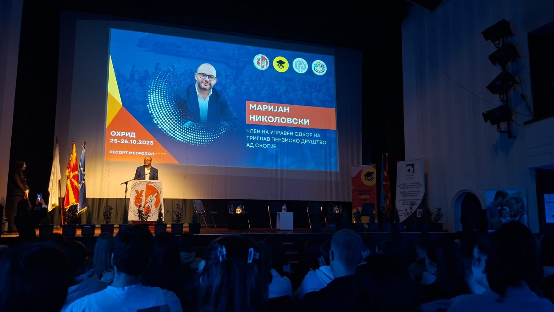 Во вториот дел од конференцијата се обрати Маријан Николовски, член на Управниот одбор на Триглав пензиско друштво АД Скопје и претседател на новоформираната Асоцијација на пензиски друштва во Северна Македонија.