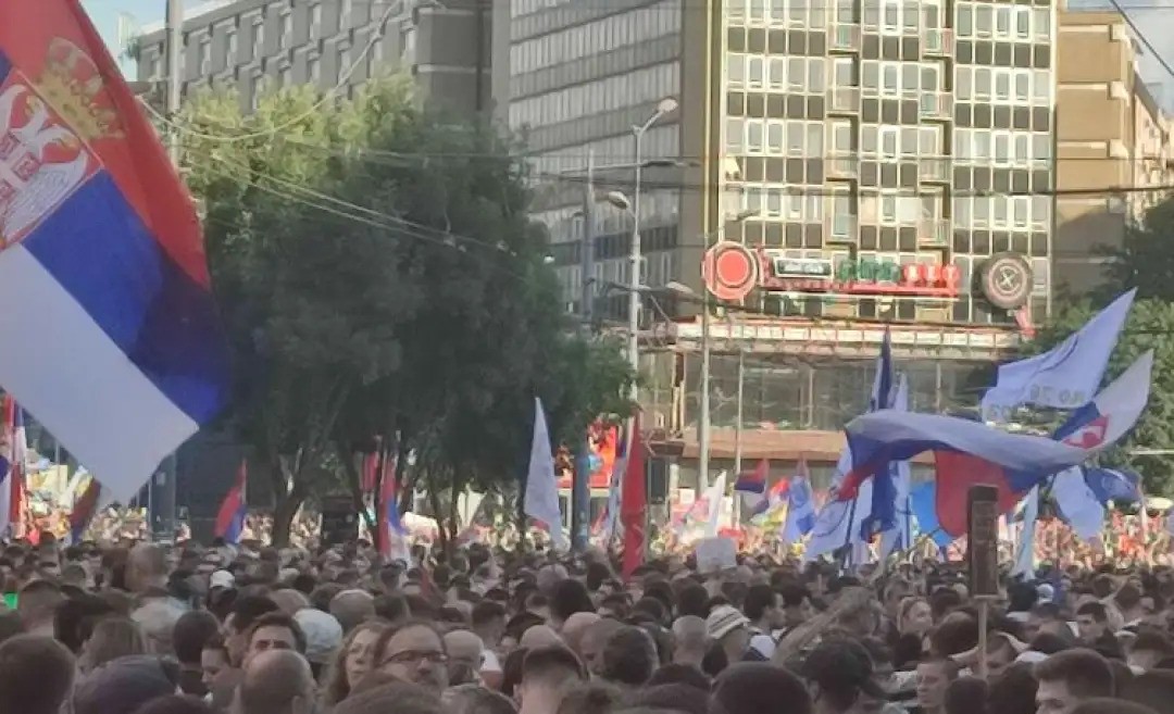 „Сакаме избори!“ скандираше толпата, носејќи српски знамиња и држејќи транспаренти со имиња на градови и места од целата држава.