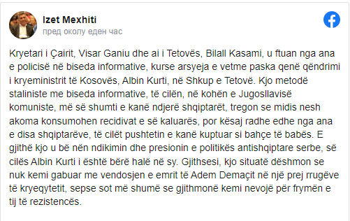 „Овој сталинистички метод на информативни разговори, кој во времето на комунистичка Југославија најмногу го чувствуваа Албанците, покажува дека рецидивите од минатото сè уште се консумираат кај нас“, вели лидерот на Демократскo движење, Изет Меџити.