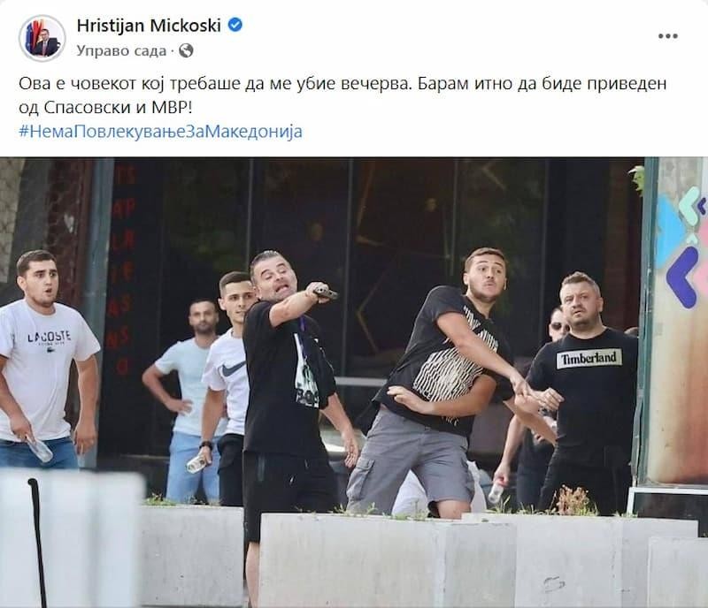 „Ова е човекот кој требаше да ме убие вечерва. Барам итно да биде приведен од Спасовски и МВР!“, напиша Мицкоски на Фејсбук.