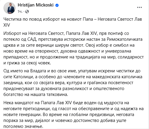 „Изборот на Неговата Светост, Папата Лав XIV, прв понтиф со потекло од САД, претставува историски настан за Римокатоличката црква и за сите верници ширум светот. Овој избор е симбол на ново време на отвореност, духовна одважност и универзална припадност, но и продолжение на традицијата на мир, солидарност и грижа за секој човек“, пишува Мицкоски во честитката објавена неговиот Фејсбук профил.