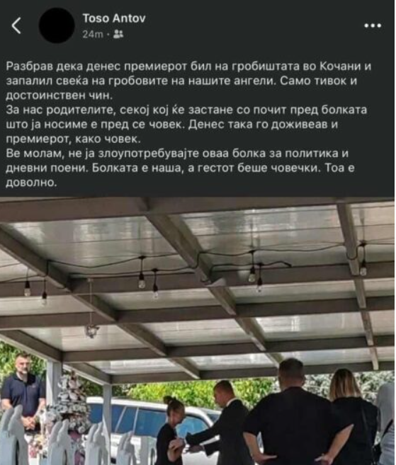 „Разбрав дека денес премиерот бил на гробиштата во Кочани и запалил свеќа на гробовите на нашите ангели. Само тивок и достоинствен чин. За нас родителите, секој кој ќе застане со почит пред болката што ја носиме е пред се човек. Денес така го доживеав и премиерот, како човек. Ве молам, не ја злоупотребувајте оваа болка за политика и дневни поени. Болката е наша, а гестот беше човечки. Тоа е доволно“, напиша Тошо Антов, татко на едно од загинатите деца.