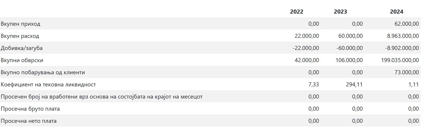 Фирмата ја завршила минатата година со загуба од 8,9 милиони денари, а по приход од 62 илјади денари и расходи од 8,96 милиони денари. Во 2022 година и 2023 година, немала приход, но влегла во минус од 22 илјади и 60 илјади денари поради расходите.