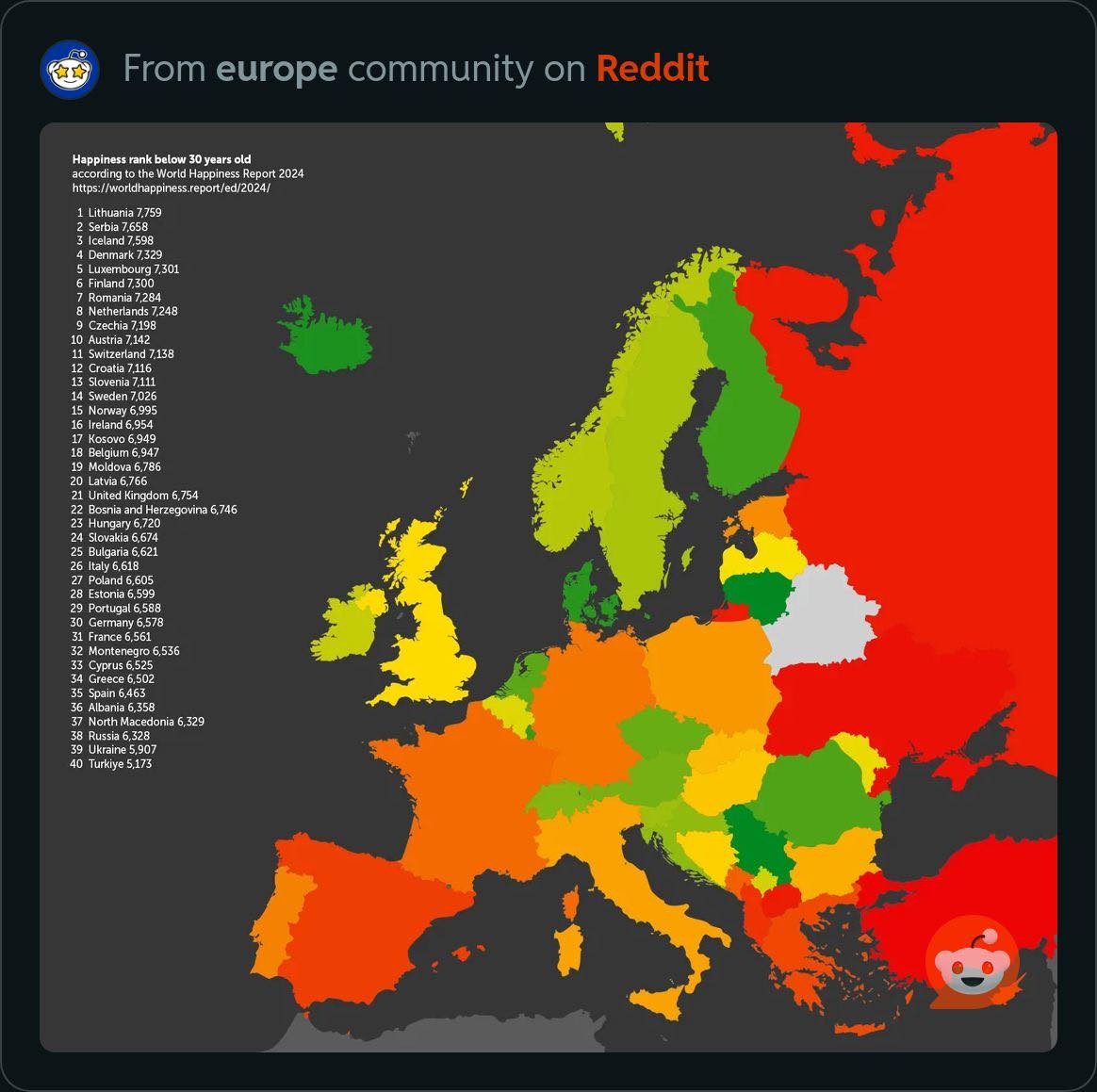 Меѓу земјите во кои младите се најзадоволни од состојбите во земјата се Литванија, Исланд, Данска и Луксембург.