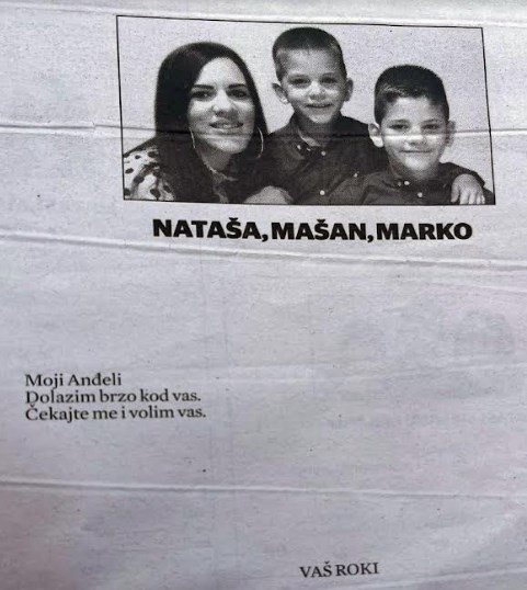 На социјалните мрежи е објавен најтажниот некролог од испраќањето на жртвите од масакрот на Цетиње. Таткото Роки кој си ги загубил најмилите синовите Машан и Марко и сопругата Наташа направил ваков некролог.