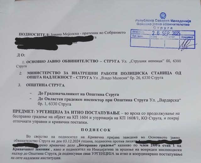 Вчера, на денот на официјалното започнување на изборната кампања, пратеничката и кандидатка за градоначалник на Струга, Јована Мојсоска ја отвори темата за дивоградбите во Струга, посочувајќи на конкретен случај во центарот на градот. Како што обзнани преку социјалните мрежи минатата недела поднела ургенција за итно постапување до Министерството за внатрешни работи, Основното јавно обвинителство во Струга и овластениот градежен инспектор во општината, поради тоа што, како што наведува, „и покрај констатирани неправилности во градењето – дивоградбата во струшката чаршија си крена уште еден спрат“, се наведува во соопштението од Левица.