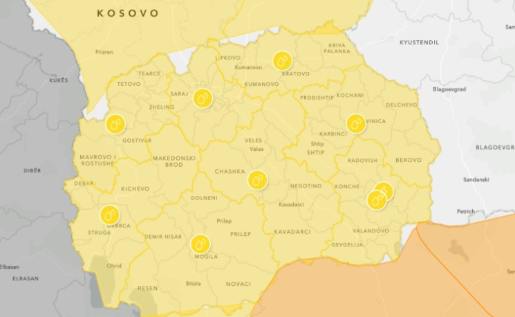 Целата територија на нашата Република Македонија на ден понеделник (10 Ноември) ќе се наоѓа во жолта предупредувачка фаза поради очекуваните обилни и поројни врнежи од дожд кои локално ќе бидат проследени со појава на грмежи и засилен ветер од јужен и од југоисточен правец. Локално ќе наврне поголемо количество на воден талог за 24 часа (над 30 литри на метар квадратен дожд). Токму поради ова можни се и локални поројни поплавувања, вели метеорологот Славчо Попоски.
