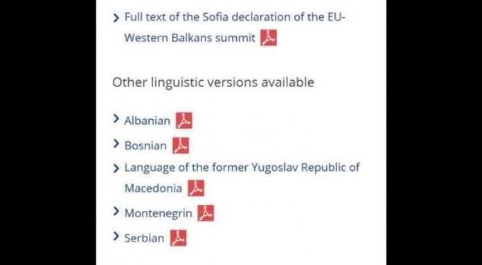 На официјалните документи од Самитот на ЕУ – Западен Балкан што се одржа во Софија, во графата за јазици намето македонски јазик стои јазик на Поранешната југословенска република Макеоднија.