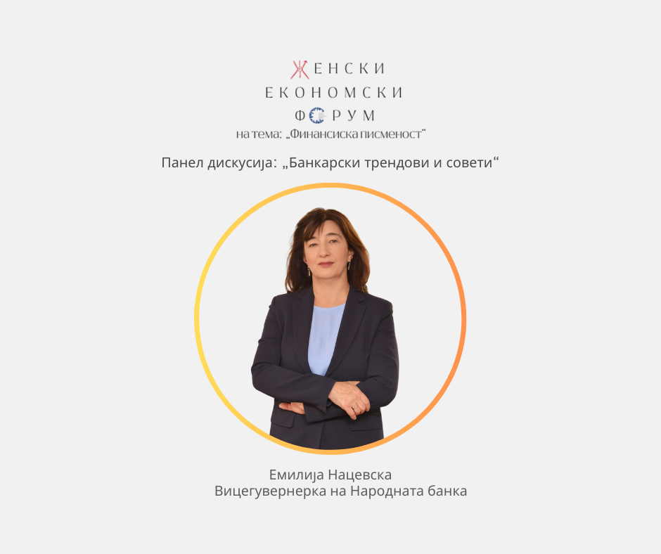 „Повисокото ниво на финансиска писменост придонесува кон повисока вклученост на населението во финансискиот систем, а со тоа и кон побрз економски развој. Подобро едуцираните и информираните клиенти подобро управуваат со личните финансии и придонесуваат кон финансиската стабилност, којашто исто така е предуслов за поголема финансиска вклученост. Оттаму, преку финансиската едукација може да се придонесе кон поголема вклученост на населението во финансиските текови, како и кон надминување на родовиот јаз и поголема вклученост на жените. Една од стратегиските цели на Народната банка е понатамошно спроведување на процесот на финансиска едукација, како и унапредување на финансиската вклученост преку стратегиски, холистички приод, а со тоа и придонес кон одржувањето на финансиската стабилност и економскиот развој.“ Ова беа дел од пораките на вицегувернерката Емилија Нацевска, која учествуваше на панел-дискусијата „Банкарски трендови и совети“, на Женскиот економски форум на тема „Финансиска писменост“.