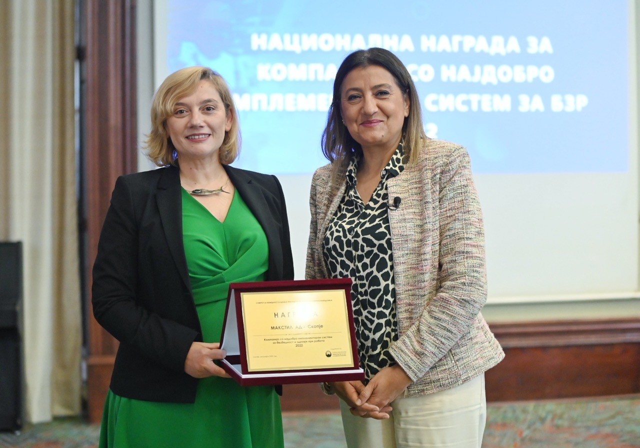 Макстил е годинешниот добитник на Националната награда за компанија со најдобро имплементиран систем за безбедност и здравје при работа. Наградата ја доделува Министерството за труд и социјална политика и Националниот совет за безбедност и здравје при работа врз основа на имплементирани активности и спроведени инвестиции за заштита на вработените во производниот процес во текот на изминатата година. Оваа награда се доделува на компании коишто се истакнале со своите активности во делот на безбедноста и здравјето при работа.
