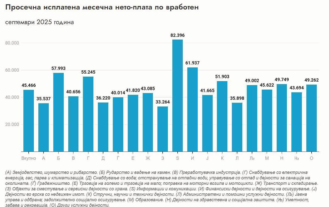 Просечната месечна исплатена нето-плата по вработен, во септември 2025 година, изнесува 45.466 денари, објави Државниот завод за статистика.