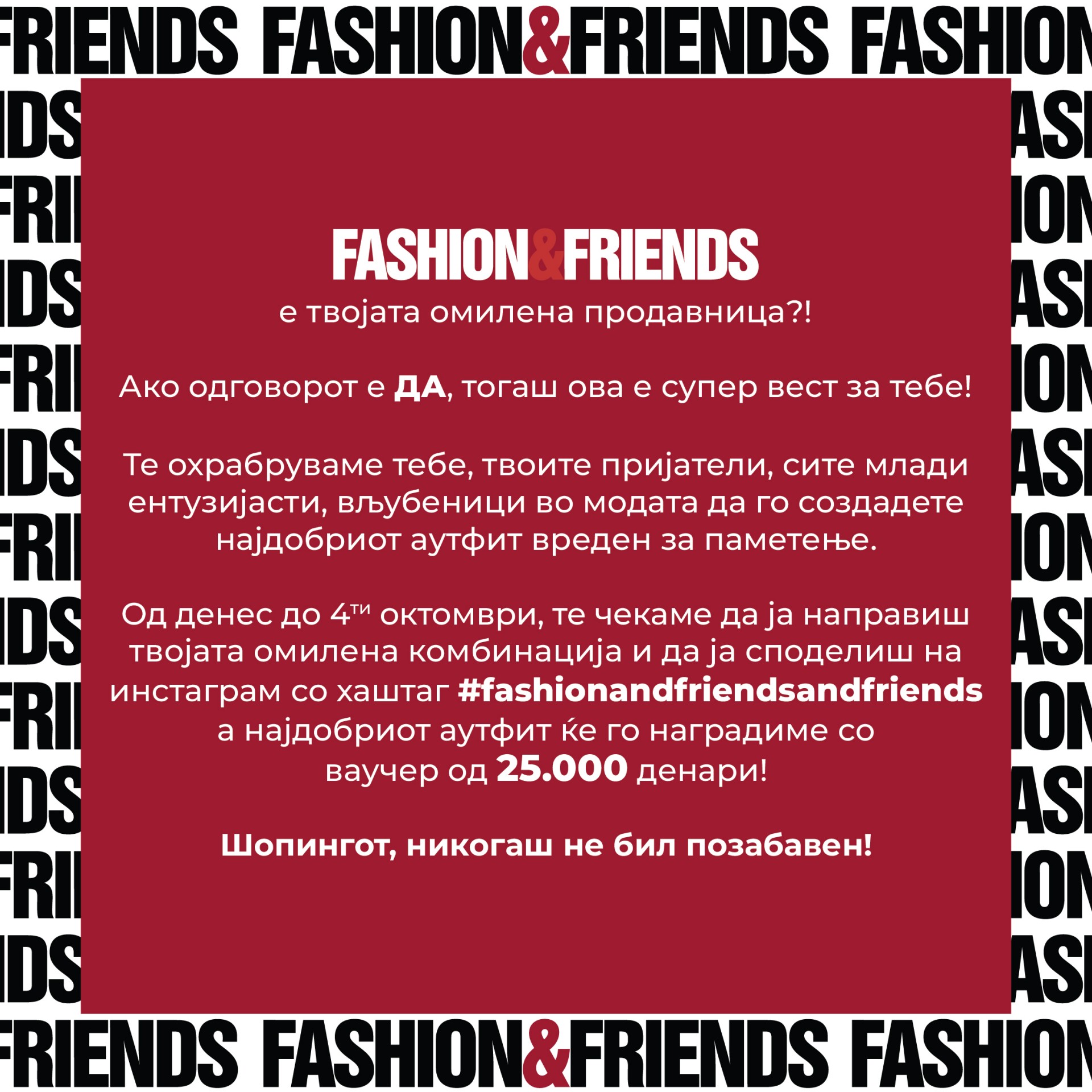 ја направиш твојата омилена комбинација и да ја споделиш на Инстаграм со хаштаг #Fashionandfriendsandfriends, а