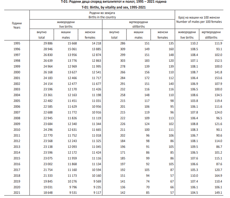 Ако во 1995 година живородени биле 29.886 деца, минатата година живородени деца во целата земја имало 18.648.