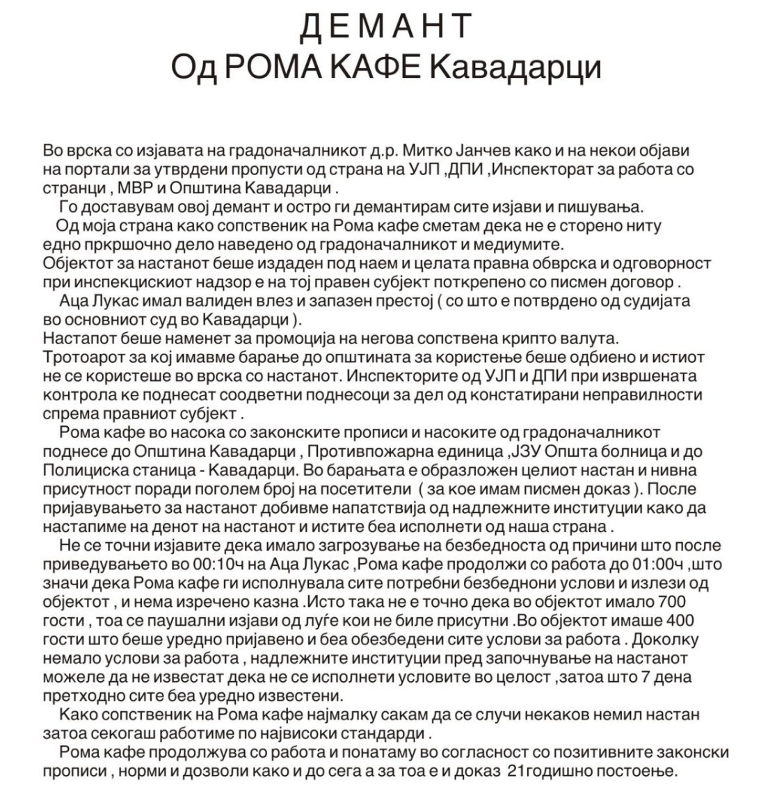 Остра реакција, демант и најава за тужба објави попладнево кафулето „Рома Кафе“ од Кавадарци каде пред некој ден настапуваше Аца Лукас, чиј настап беше прекинат од полициските екипи, а притоа пејачот беше уапсен и спроведен во станица.