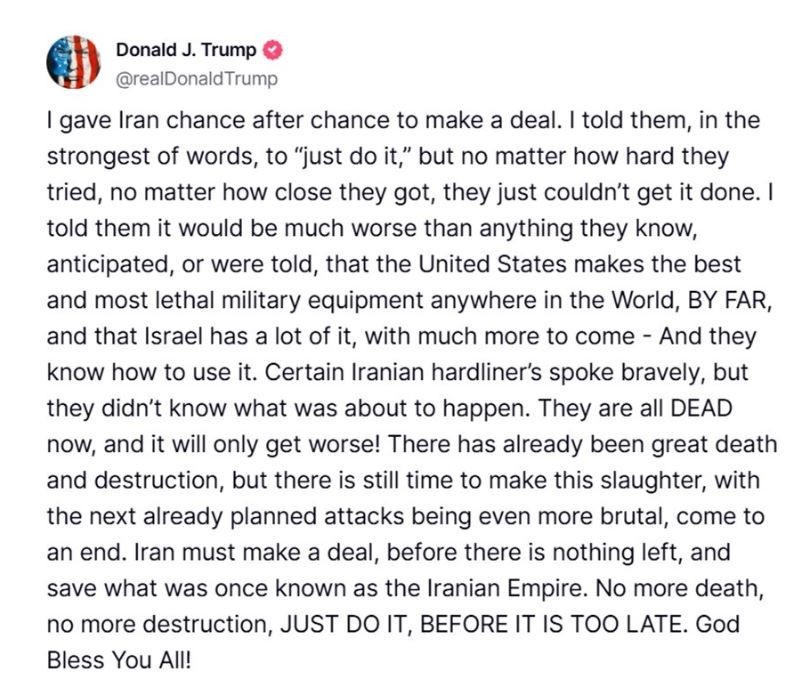 „Му дадов на Иран можност по можност да постигне договор. Им реков, со најсилни зборови: „Само направете го тоа“.“ Но, колку и да се трудеа, колку и да беа блиску, едноставно не можеа да го сторат тоа. Ги предупредив дека ќе биде многу полошо отколку што знаеја, очекуваа или им беше кажано, дека Соединетите Држави го произведуваат најдоброто и најсмртоносното оружје во светот - убедливо најдоброто - и дека Израел има многу од него, а наскоро ќе има уште повеќе. И тие знаат како да го користат.