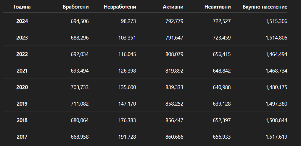 Споредено со последните достапни статистички податоци во 2024 година состојбата била следна: за речиси 19.500 повеќе вработени или повеќе создадени работни места, бројот на невработени е намален за околу 93.500 луѓе, но бројот на активно население е намален за околу 68.000