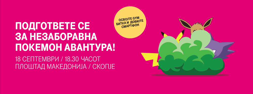 Недела, 18 септември е празник за сите Pokѐmon ентузијасти. Од 18:30 часот на градскиот плоштад Македонија, Македонски Телеком им овозможува незаборавна авантура во живона сите локални Pokѐmon трагачи и ги поканува на масовна Gym битка.