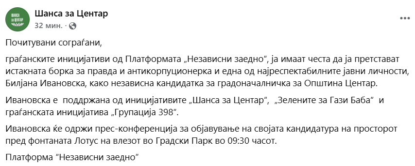„Независни заедно“: Билјана Ивановска влегува во трката за градоначалничка за Општина Центар