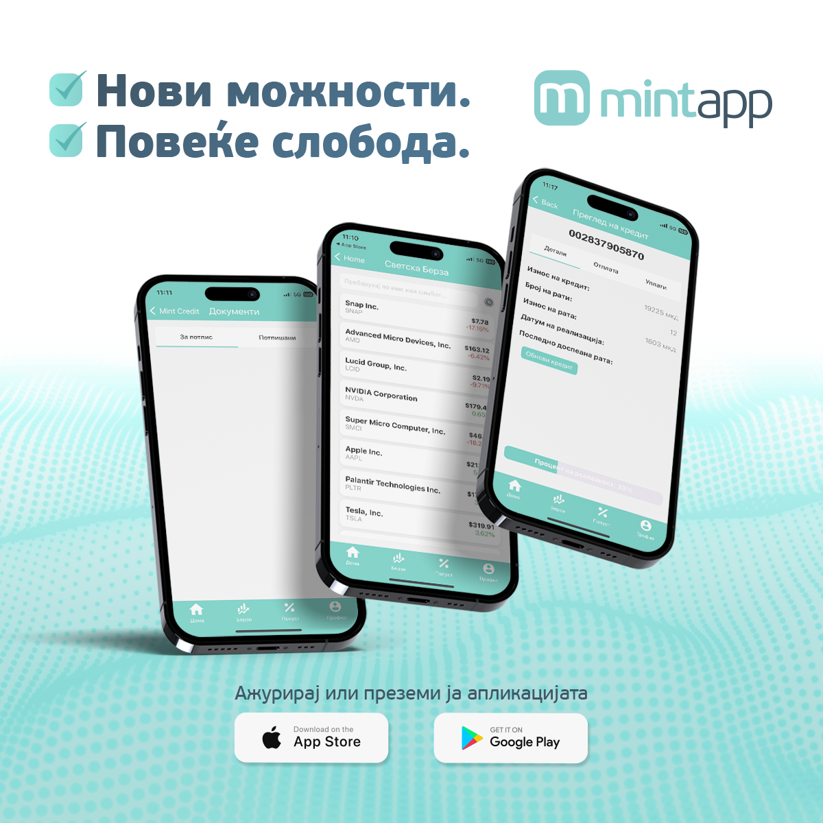 - Потпис на кредит преку Mint App - Целосно дигитално кредитирање, од аплицирање до потпис! Новата функционалност Ви овозможува да го потпишете вашиот кредитен договор електронски, во само неколку едноставни чекори.