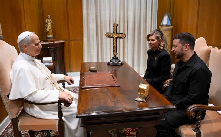Поглаварот на Римокатоличката црква, папата Лав XIV, кој денеска говореше на Плоштадот Свети Петар за „маченичката Украина“ и „исчекувањето на преговори за праведен и траен мир“, за првпат во приватна аудиенција го прими нејзиниот претседател Володимир Зеленски, во придружба на сопругата Олена.