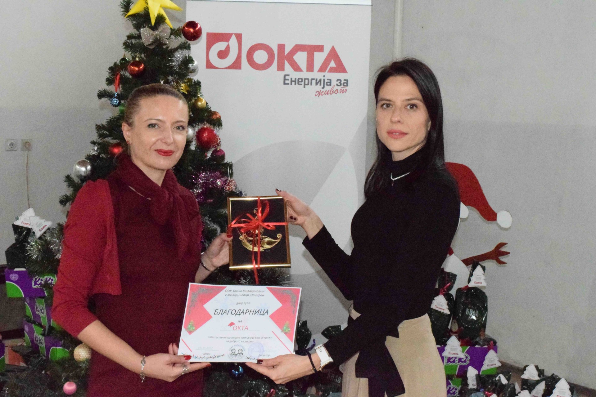 „Детските насмевки и радост се најдрагоцената и најубава слика на новогодишните празници. Ќе бидеме среќни доколку оваа наша донација им ги разубави празничните денови на децата од нашето соседство и ќе ги направи уште посреќни“, рече Марија Ставрева, менаџер за корпоративна општествена одговорност и комуникации од ОКТА при предавањето на пакетчињата.