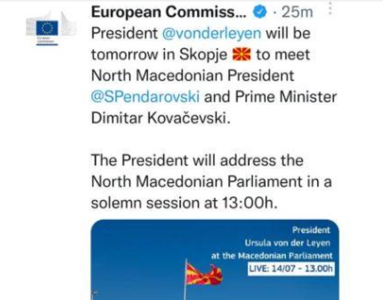 ЕК попладнево на Твитер објави дека претседателката Урсула фон дел Лајен утре во Скопје ќе се сретне со, како што пишува во објавата „северномакедонскиот претседател Стево Пендаровски и премиерот Димитар Ковачевски“. По околу половина час, твитот го избришаа. Фон дел Лајен во 13 часот ќе има обраќање во „северномакедонскиот парламент“, објави во твитот официјалниот налог на Европската комисија на социјалната мрежа. Утре напладне ќе има протест во Скопје. Полицијата најави дека ќе ја гарантира безбедноста на Собранието и пратениците.