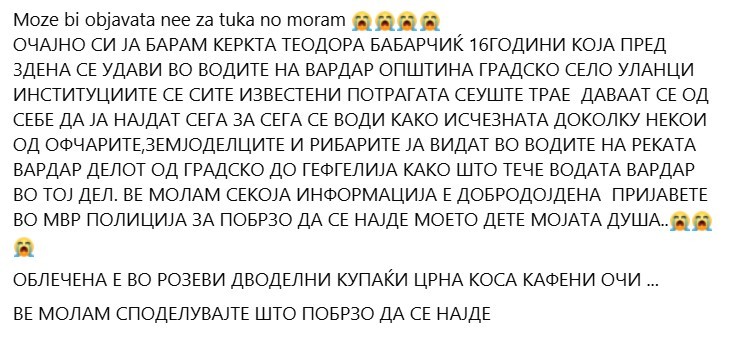 „Очајно си ја барам ќерката Теодора Бабариќ, 16 години, која пред 3 дена се удави во водите на Вардар, Општина Градско-Уланци. Институциите сите се известени, потрагата се уште трае. Даваат се од себе да ја најдат, сега за сега се води како исчезната. Доколку некој од овчарите, земјоделците, рибарите ја видат во водите на реката Вардар, делот од Градско до Гевгелија, како што тече водата во тој дел, молам за информација, секоја информација е добредојдена. Пријавете во МВР, за побрзо да се најде моето дете, мојата душа. Облечена е во розеви дводели купаќи, црна коса, кафени очи... Ве молам споделувајте за што побрзо да се најде“, објави мајката на Теодора.