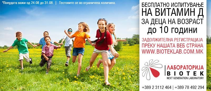 За таа цел, БИОТЕК Лабораторија во периодот од 24 до 31 август ќе овозможи бесплатно испитување на Витамин Д за деца до 10 години. Сè што треба да направите е да го закажете вашиот термин преку нивната веб страна www.bioteklab.com.mk