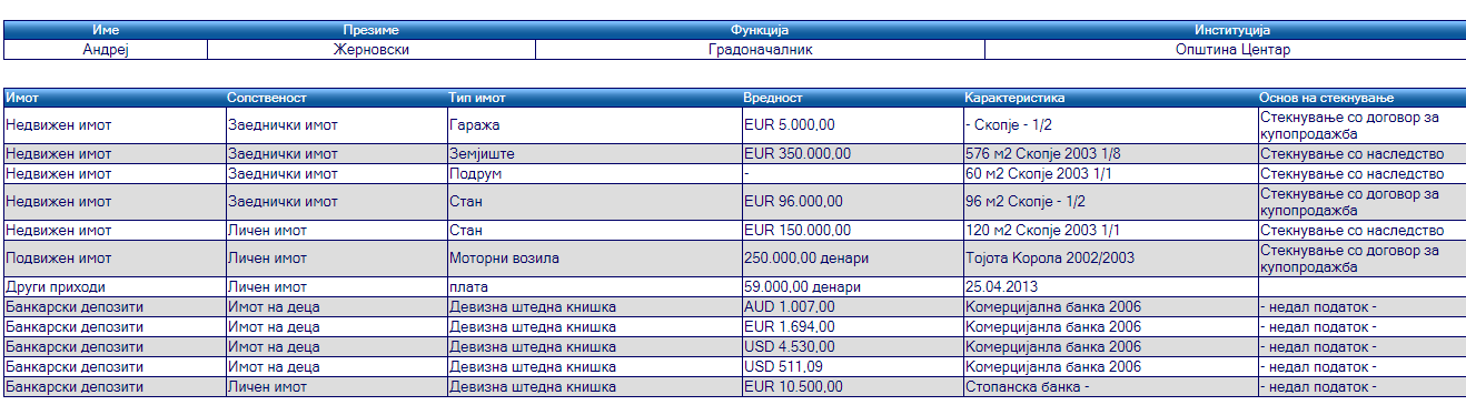 Во однос на имотниот лист, Жерновски пријавил стан, моторно возило и плата на свое лично име.