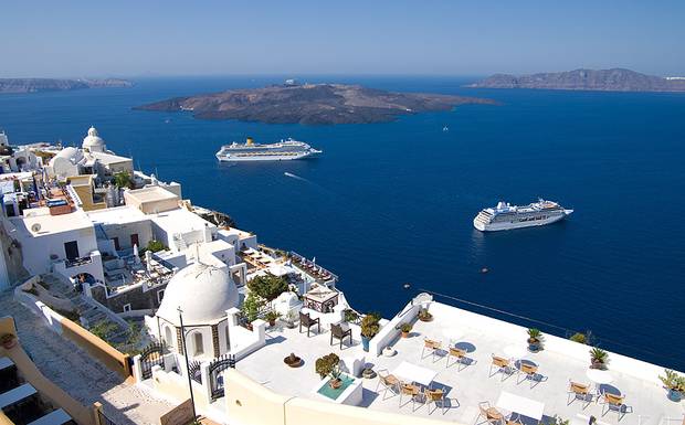 Санторини. Ноќевање во малото село, познато по своите бели куќи со сини врати и куполи, изнесува во просек