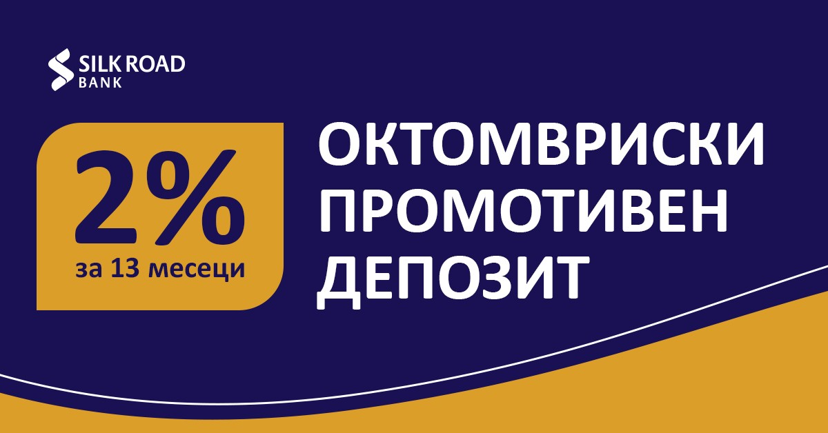 Традиционално во октомври, месецот на штедење Силк Роуд банка АД Скопје подготви атрактивна понуда за своите клиенти кои сакаат да штедат во денари. Имено, сè до 31.10.2022 година, клиентите кои ќе ја одберат опцијата денарски депозит на 13 месеци, добиваат двојно повисока, фиксна камтна стапка од 2%. Минималниот износ на влог изнесува 15.000 денари.