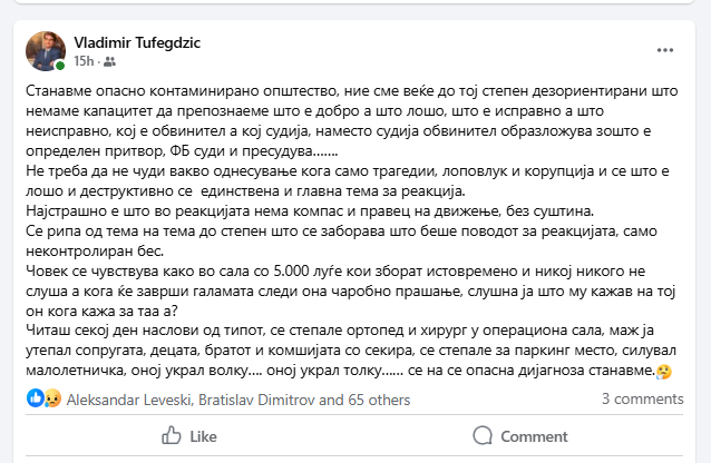 Адвокатот Владимир Туфегџиќ е разочаран од тоа какво опшетство станавме, дезориентирано и деструктивно, а тоа го пренесе и преку својот фејсбук профил.