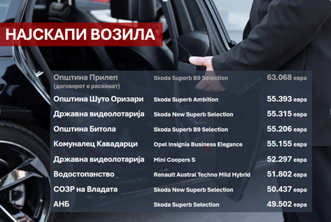 Најскапи возила, од по 55 илјади евра, набавиле: Општина Шуто Оризари, Државна видеолотарија, Општина Битола и Комуналец Кавадарци. Убедлив рекордер ќе беше Општина Прилеп која во декември 2024 година склучила договор за набавка на лизинг на возило од 63 илјади евра. Но, како што тврдат од општината, договорот е раскинат во февруари оваа година и возилото не е земено. Сепак, на Електронскиот систем за јавни набавки не е објавено раскинувањето на овој договор.